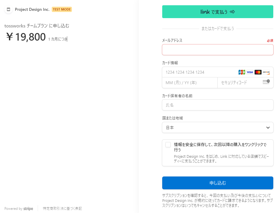 なお、tossworksへの支払いは外部サービスであるStripeによって行われます。